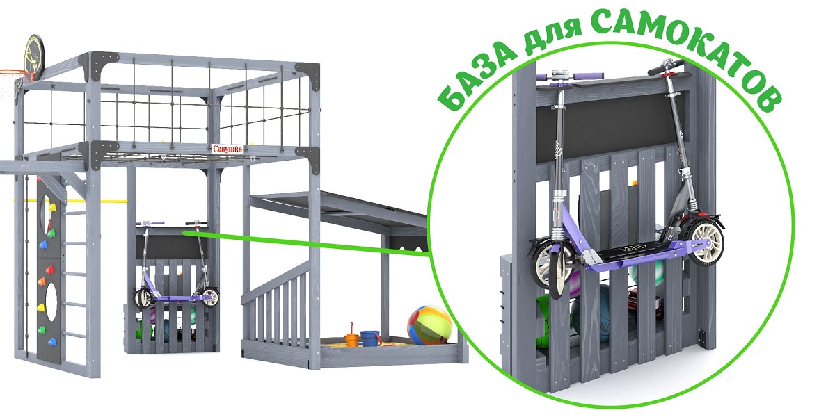Удобство и порядок: база для самокатов на 2 штуки и ящик-скамья для мячей с резинкой помогут сохранить порядок на площадке и в саду.Творческое развитие: меловая доска и органайзер для мелочей — для записей, рисования и планирования игр.