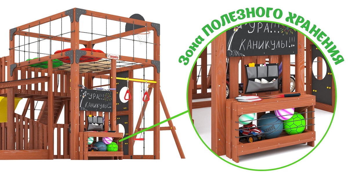 База для самокатов (на 2 штуки), органайзер и ящик-скамья с резинкой для мячей — всё на своих местах, и ничего не потеряется.