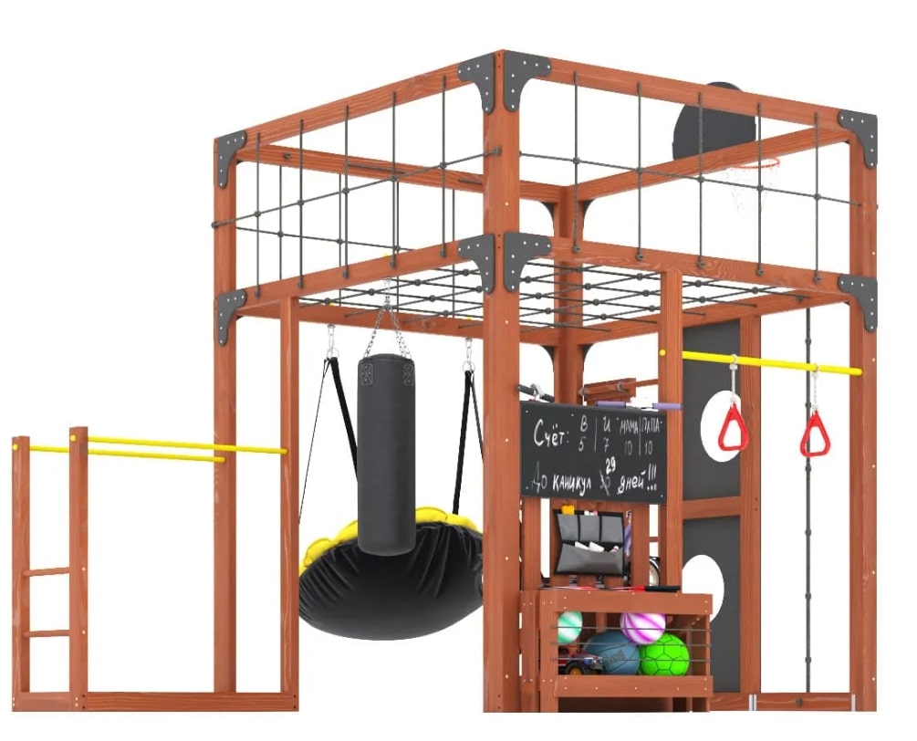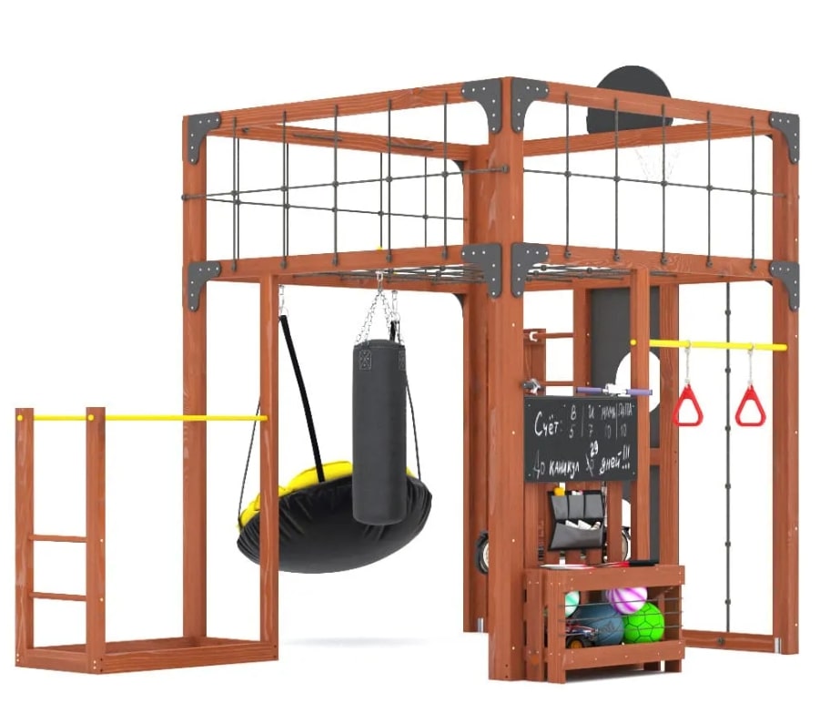 Нижний спортивно-игровой уровень: включает боксерскую грушу, гимнастические кольца и параллельные брусья для разнообразных физических упражнений.