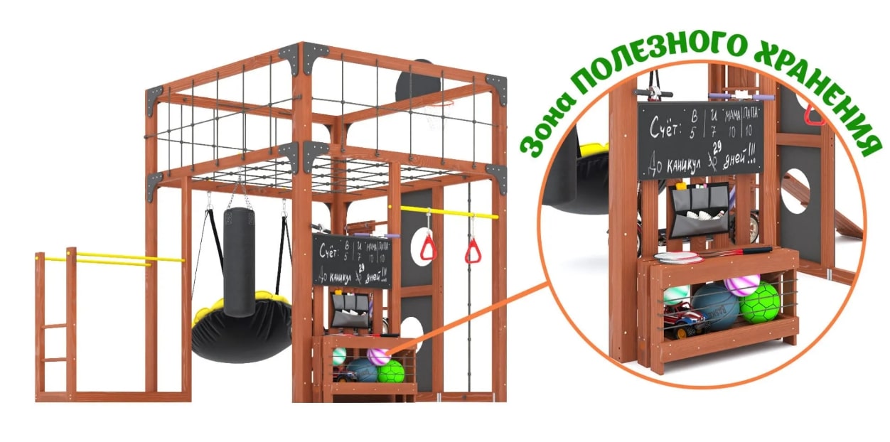 Зона полезного хранения: предусмотрены места для аккуратного размещения самокатов, мячей и мелких игрушек, приучая детей к порядку.