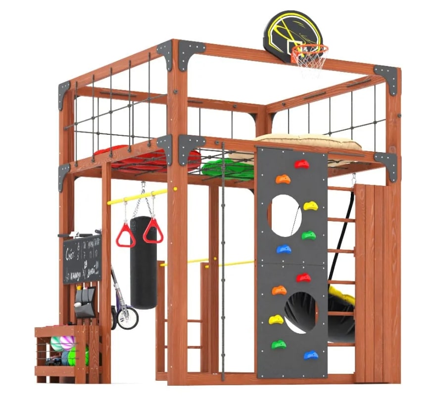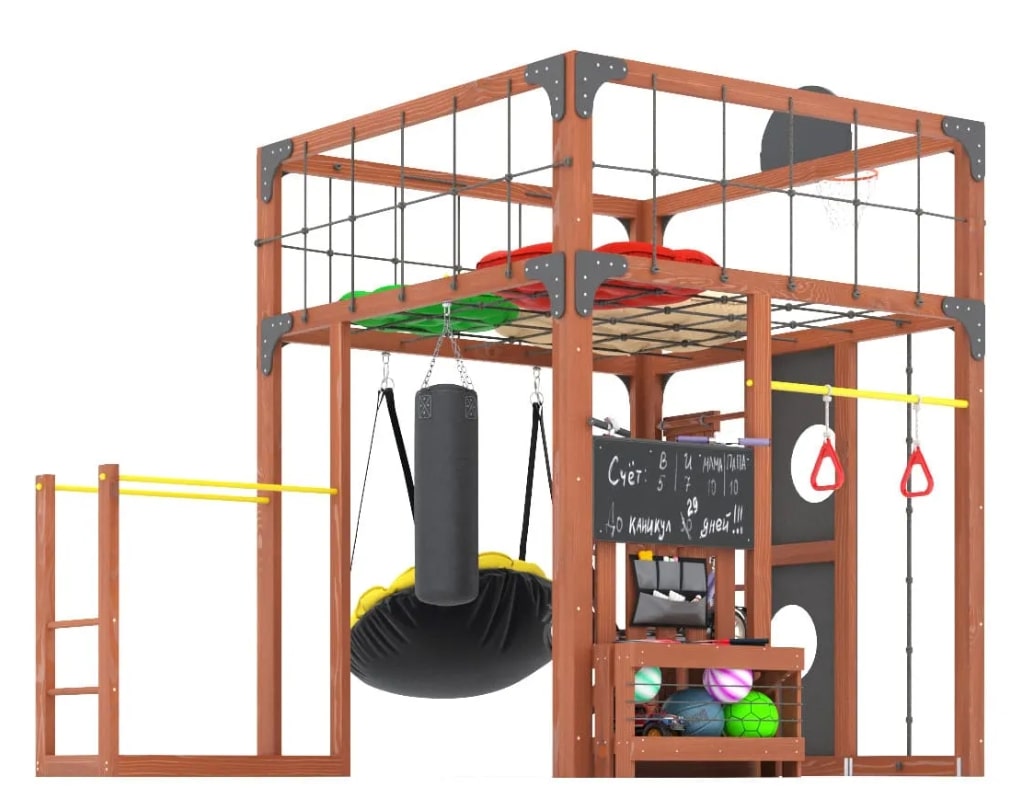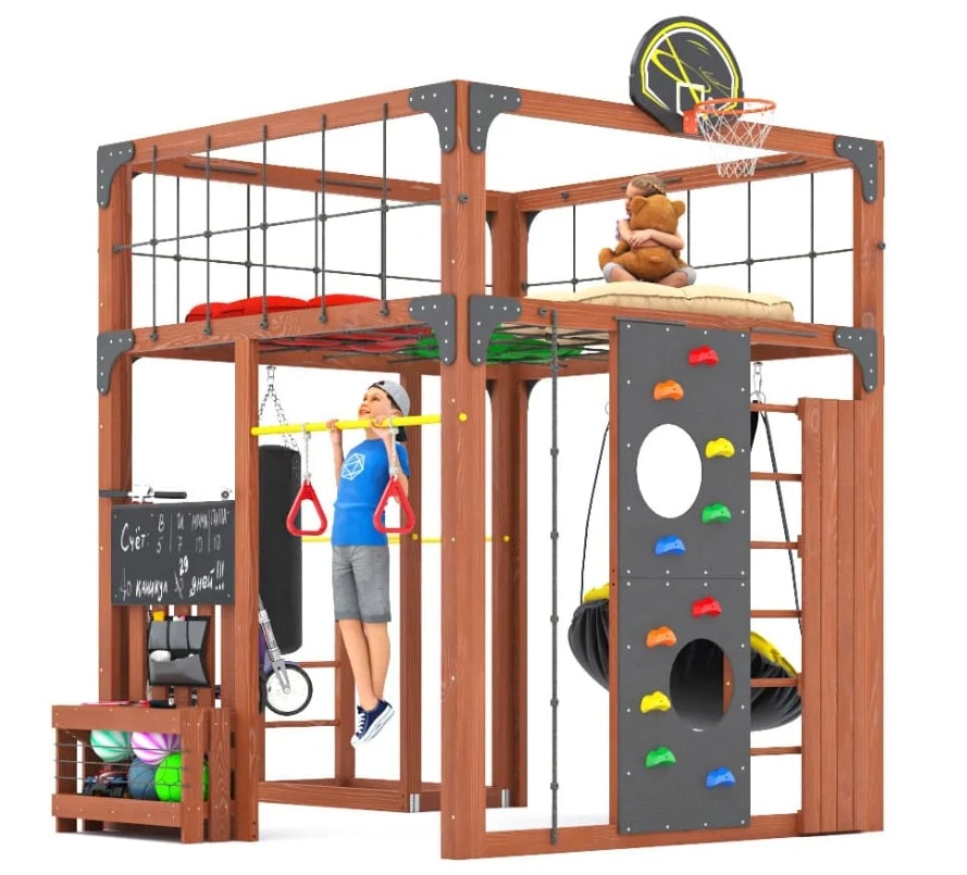 Савушка КУБ – 1 это многофункциональный комплекс сочетает в себе все необходимое для активных игр, спортивных упражнений и уютного отдыха. С элегантным цветом Серый или Махагон, площадка органично впишется в любой двор, предоставив детям пространство для творческого и физического роста, а родителям – уверенность в безопасности и качестве.Многофункциональность: Игровая площадка включает в себя верхний и нижний спортивные уровни, скалодром, шведскую стенку, гимнастические кольца и боксерскую грушу для активных занятий спортом. Подвесное кресло PapaSAV и двухсторонние подушки создают уютное место для отдыха после игр.