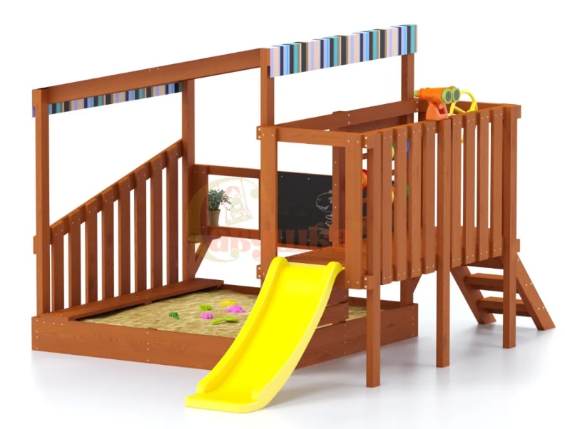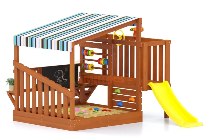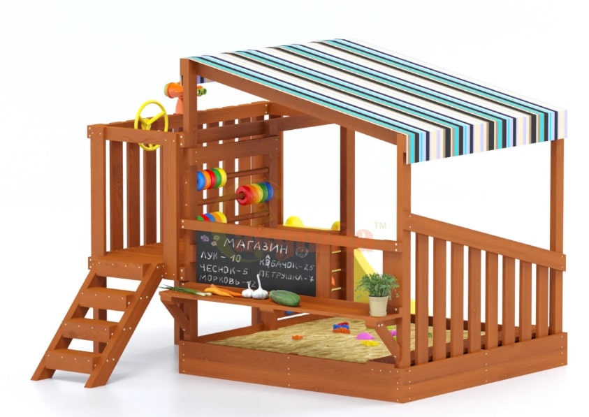 Детский песочный домик Игровой комплекс Песочный дворик Савушка-3 - это целый комплекс для активного отдыха и развития ребенка на свежем воздухе. Игровой домик с крышей - защищает от солнца и дождя, создает уютную атмосферу для игр и отдыха. Игровой балкончик и бинокль - для увлекательных сюжетных игр и наблюдения за окружающей природой. Горка и скалодром - способствует развитию координации движений, равновесия, силы и ловкости. Обязательный атрибут всех морских приключений и управления "кораблем" – руль. Кольца-счеты необходимы для развития математических навыков и логического мышления малышей. Для творческих игр с песком, развития мелкой моторики и воображения – песочница. Прилавок - для размещения игровых предметов и удобства игры. Создаст уютную атмосферу и защитит от солнца декоративная перлога. Еще в комплекте идет меловая доска для творческих занятий, рисования и обучения.