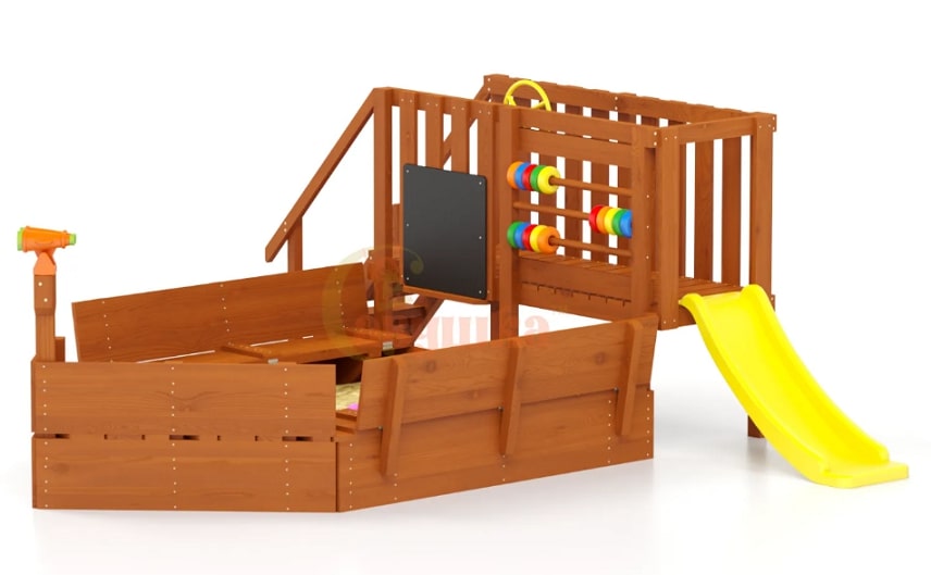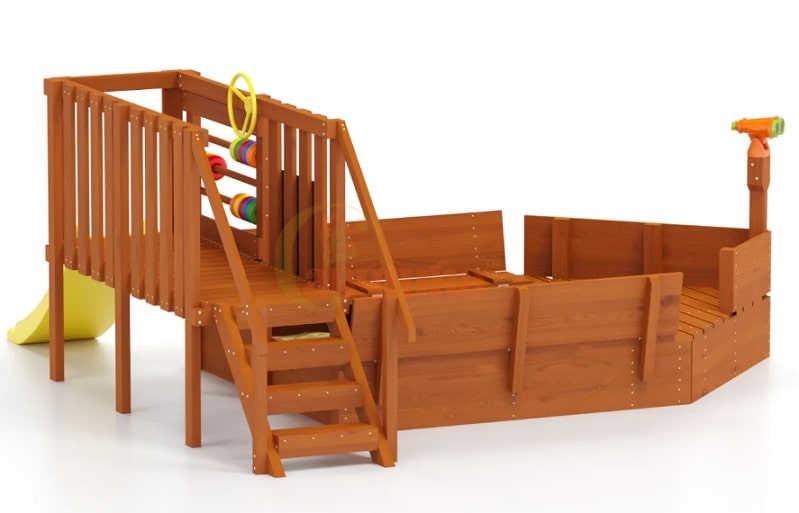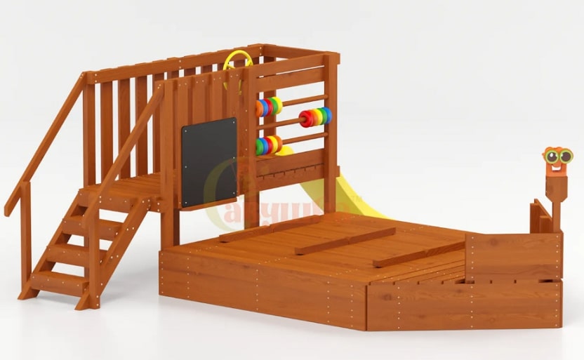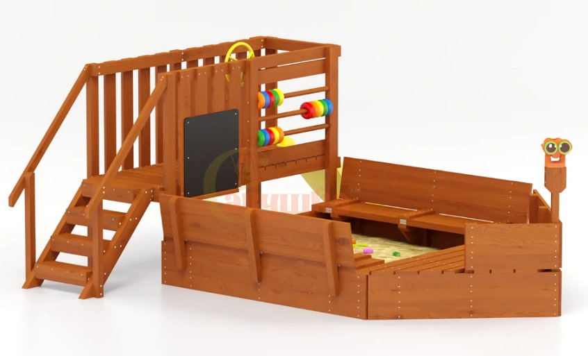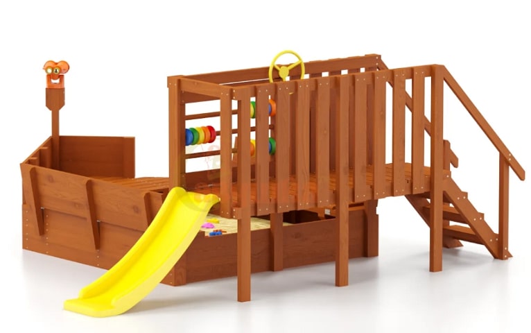 Игровой кораблик с рулем и биноклем малого размера позволят ребенку окунуться в морские приключения, а игровой балкончик создаст уютную атмосферу для сюжетных игр и наблюдения за окружающей природой. Горка и лестница помогут развивать силу, ловкость и координацию движений, а кольца-счеты – математические навыки и логическое мышление.