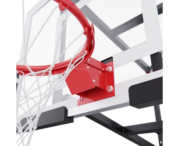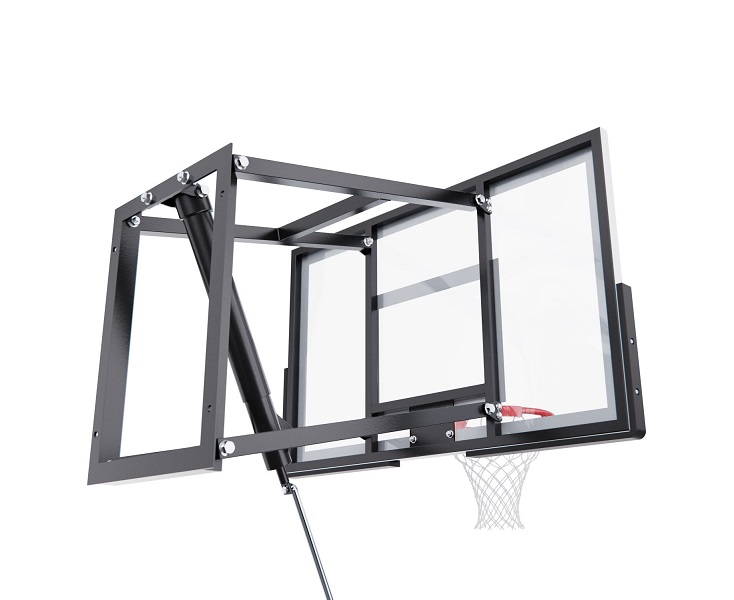 Щит изготовлен из прочного закаленного сткекла толщиной 6 мм — материала, обеспечивающего отличный отскок мяча и устойчивость к ударам. Его размеры — 110 х 70 см, что делает его максимально приближенным к профессиональному оборудованию. Регулируемый вынос щита (51–55,5 см) повышает безопасность и удобство во время игры. Дополнительную безопасность обеспечивает защита Poly Pade, установленная по нижнему краю щита.