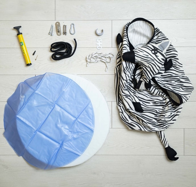 В комплект входит гамак и два вида сиденья к нему (подушка надувная и из поролона), а также насос, крепежи и шнуры для монтажа изделия.